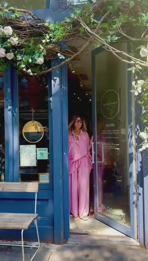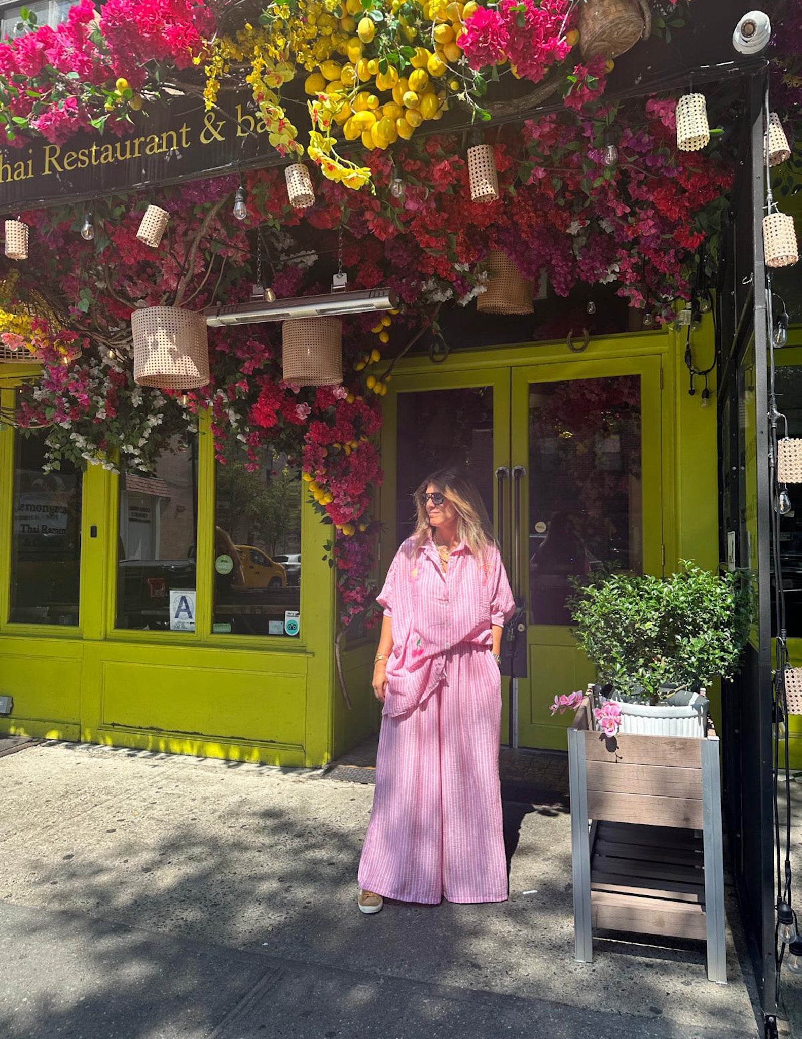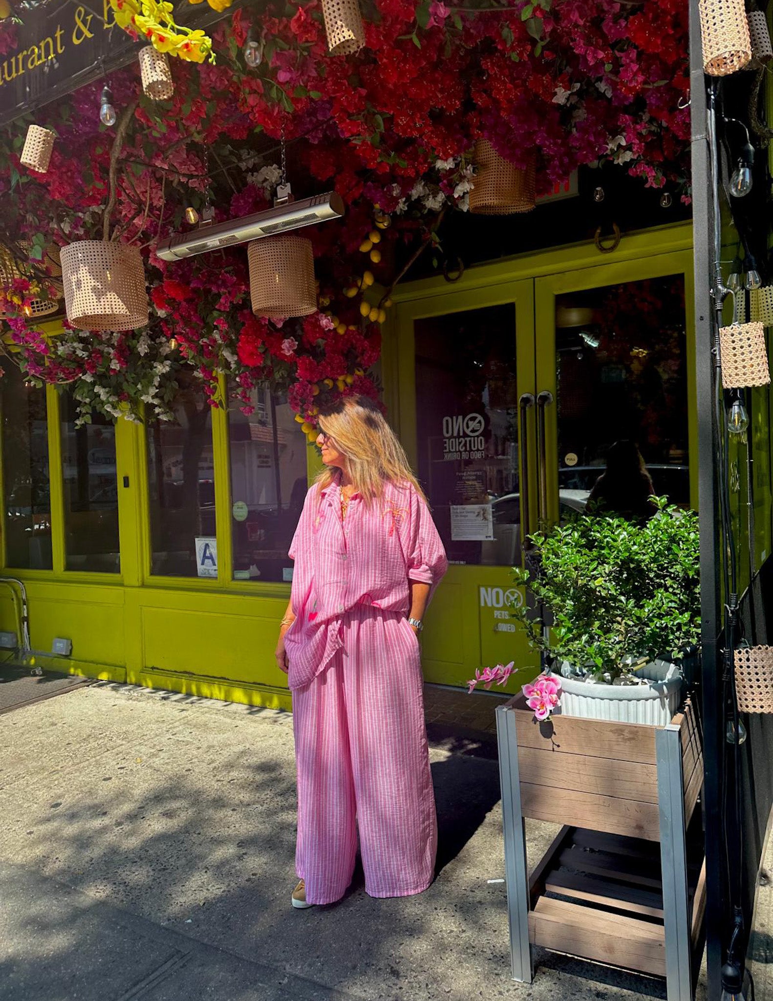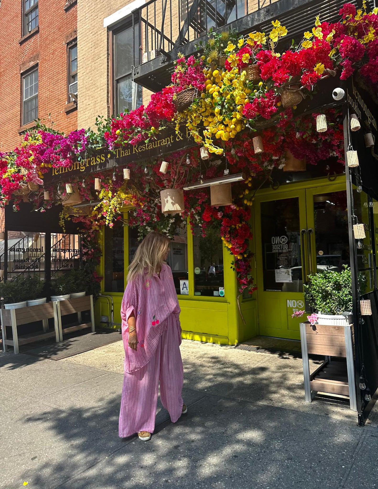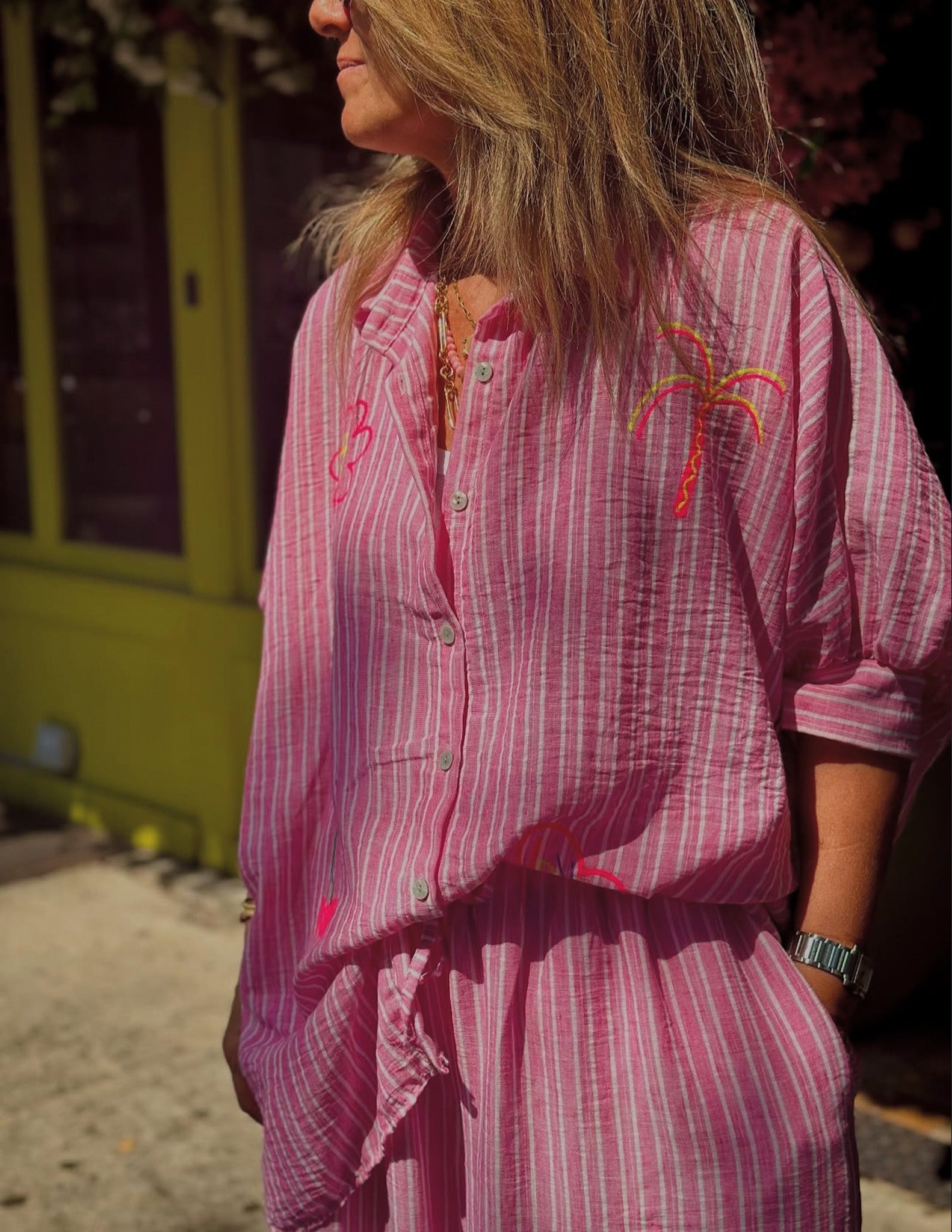 Camisa oversized com manga 3/4 e desenhos na frente e calças com elástico e atilho