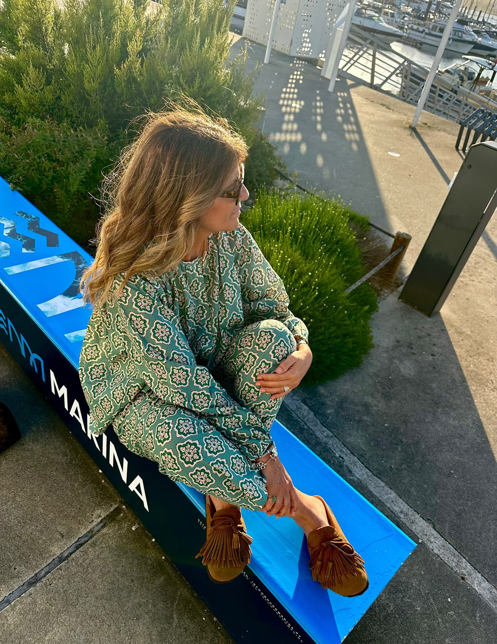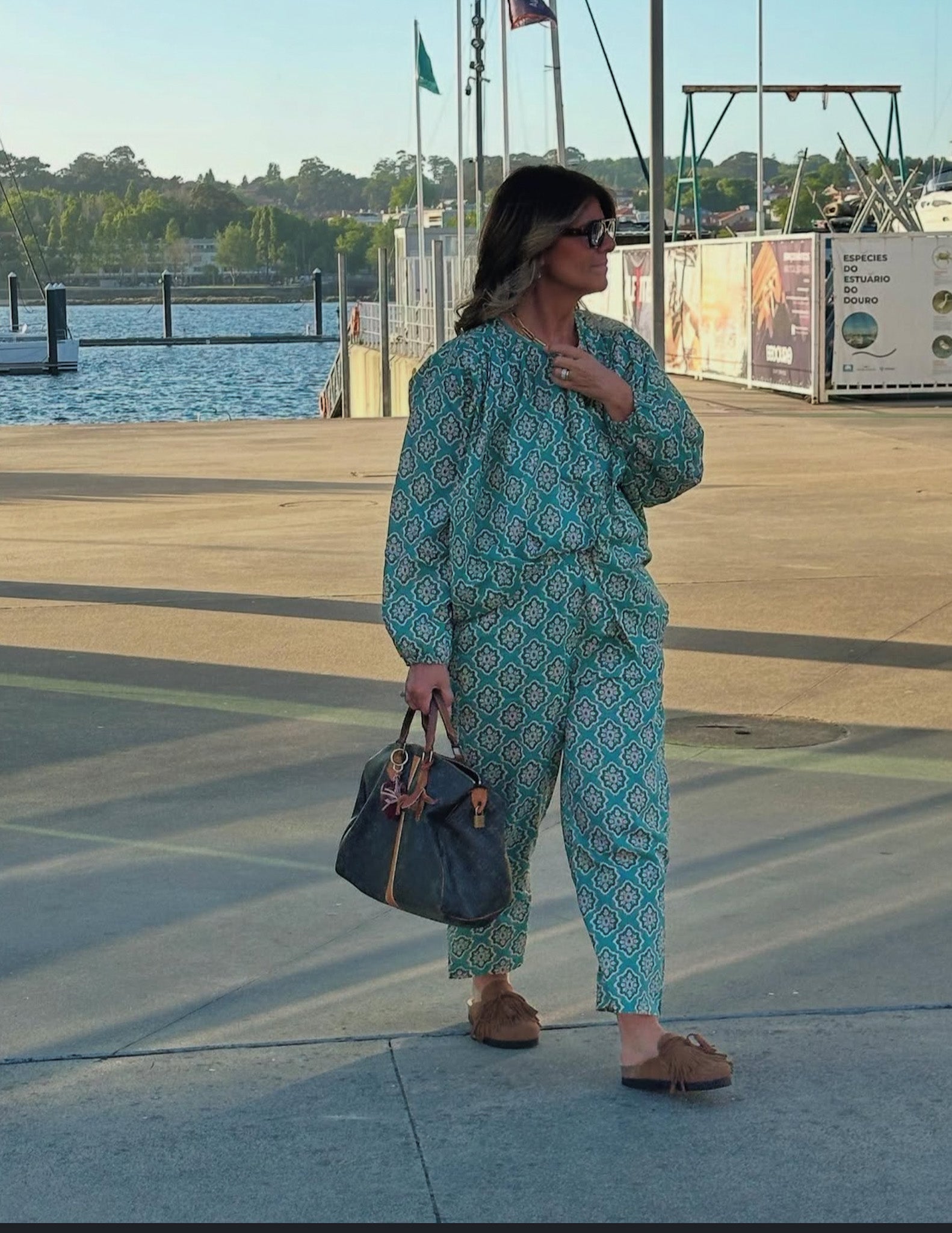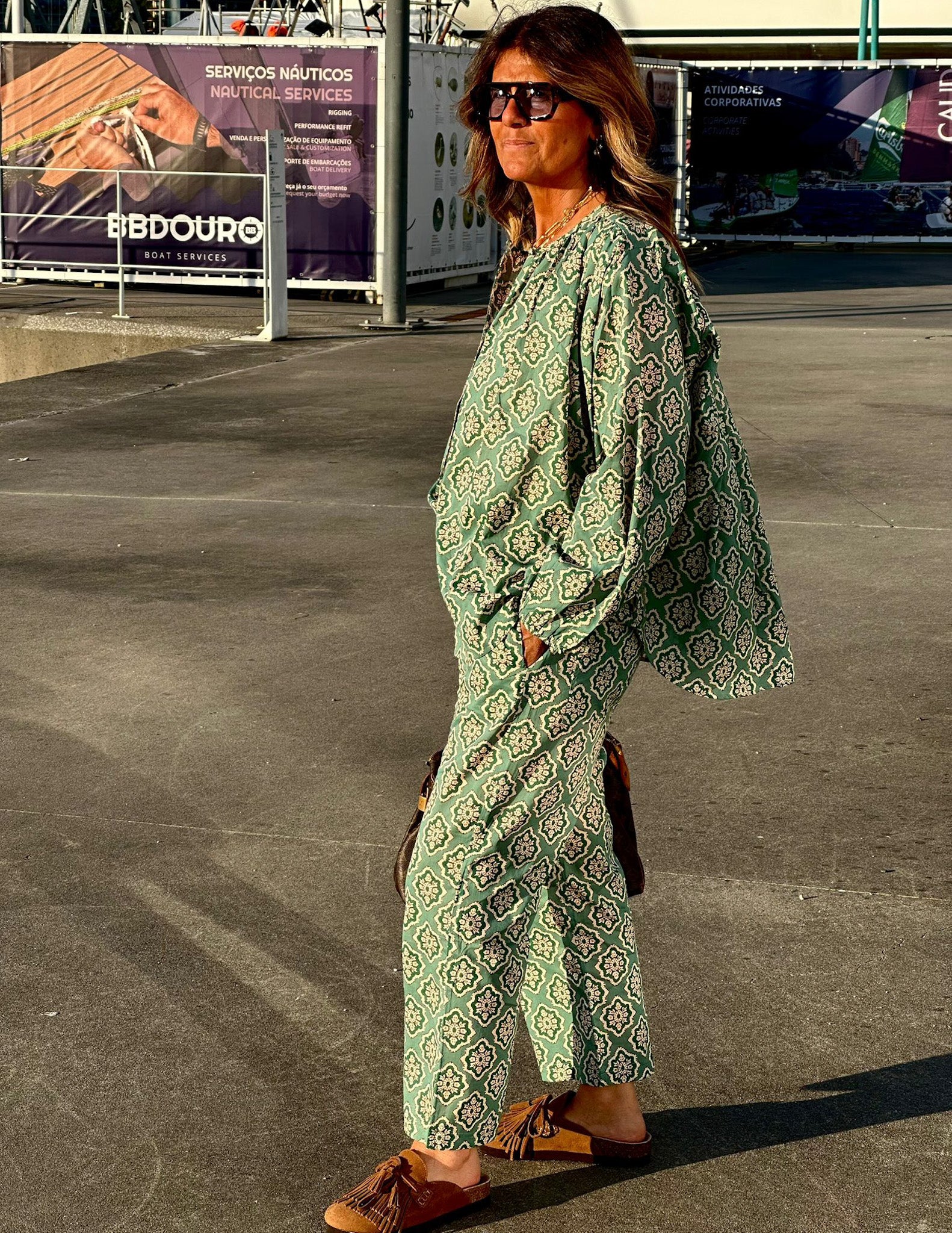 Conjunto composto por túnica oversize e calças com elástico e bolsos
