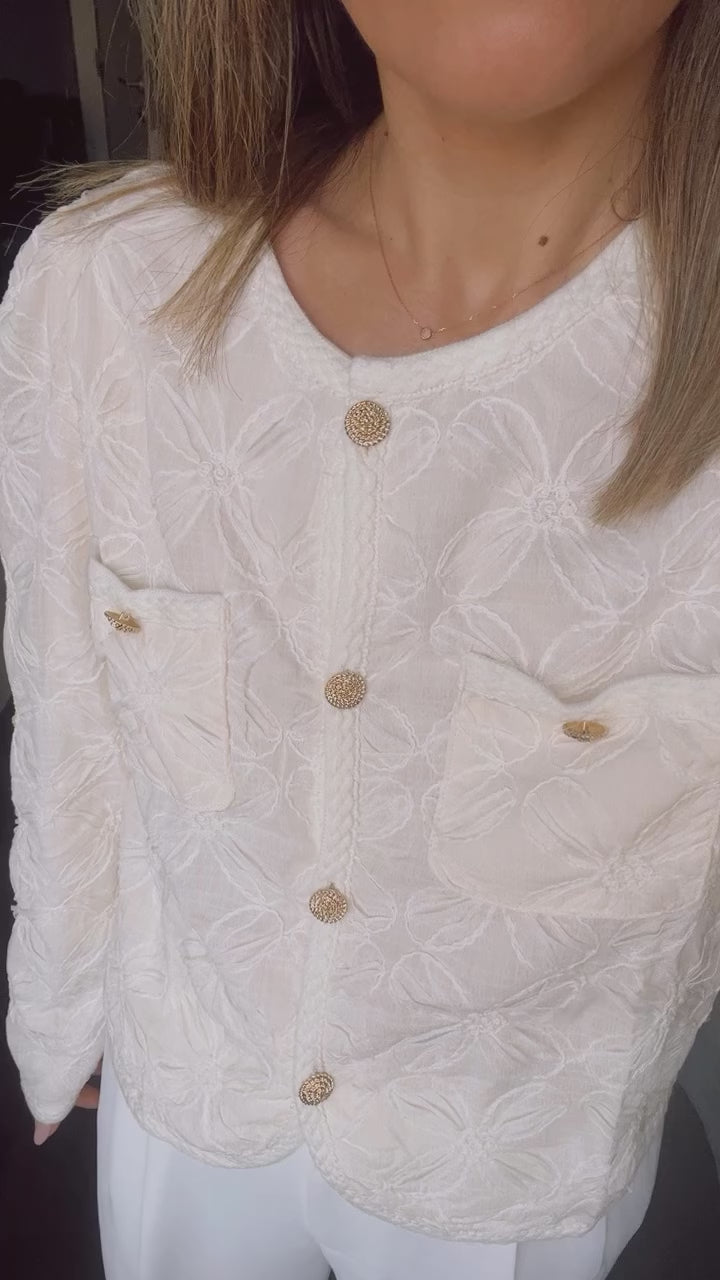 Jacket with embroidered flowers and golden buttons, in ecru color