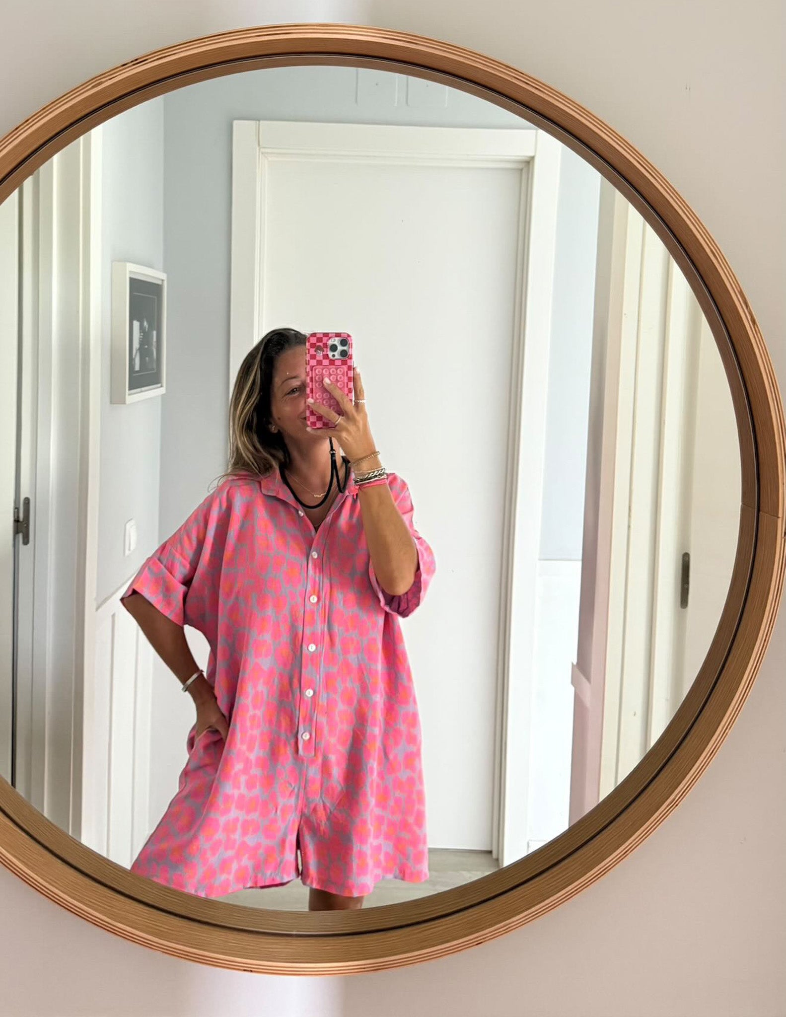 Macacão com padrão leopardo e fundo lilás escuro/azul
