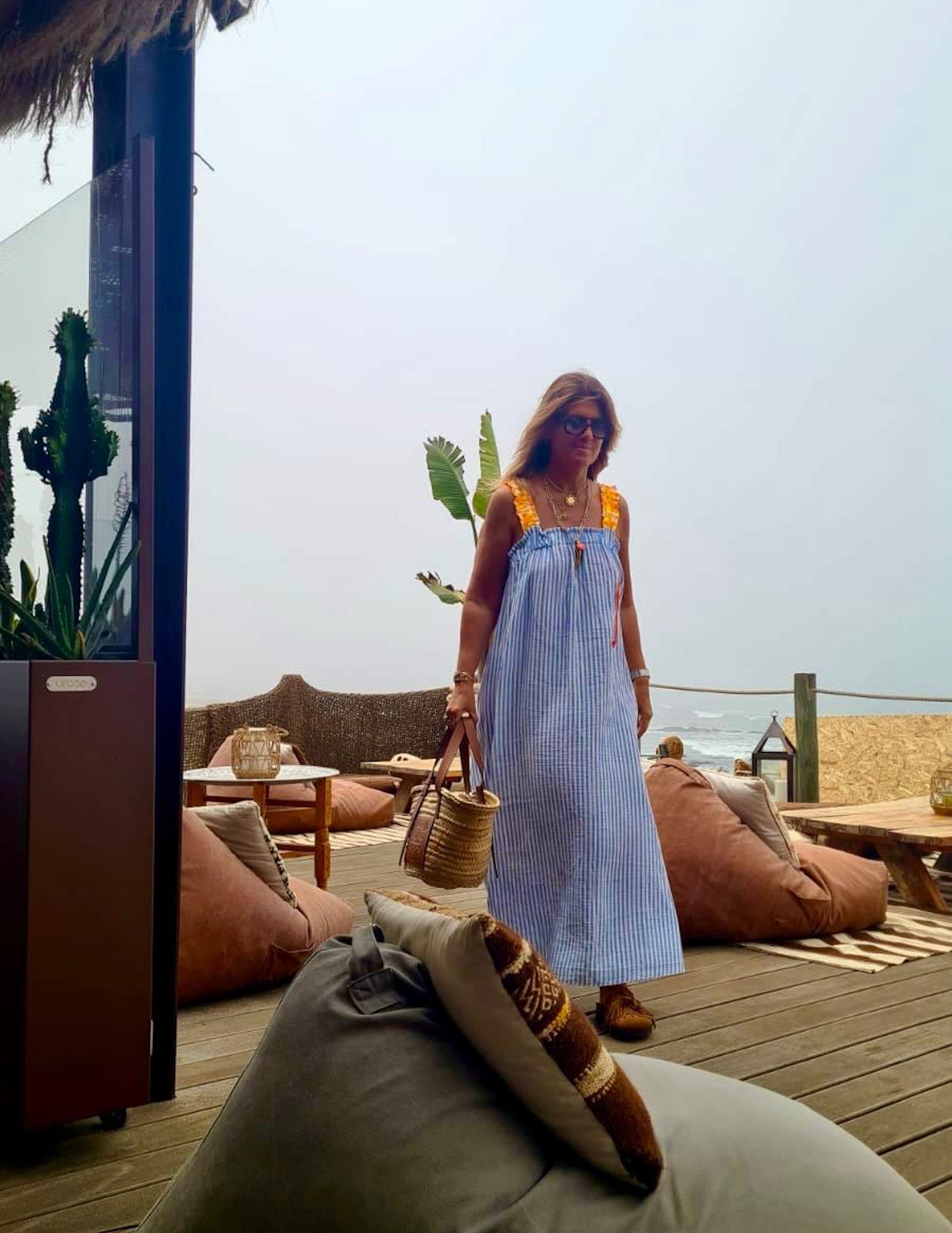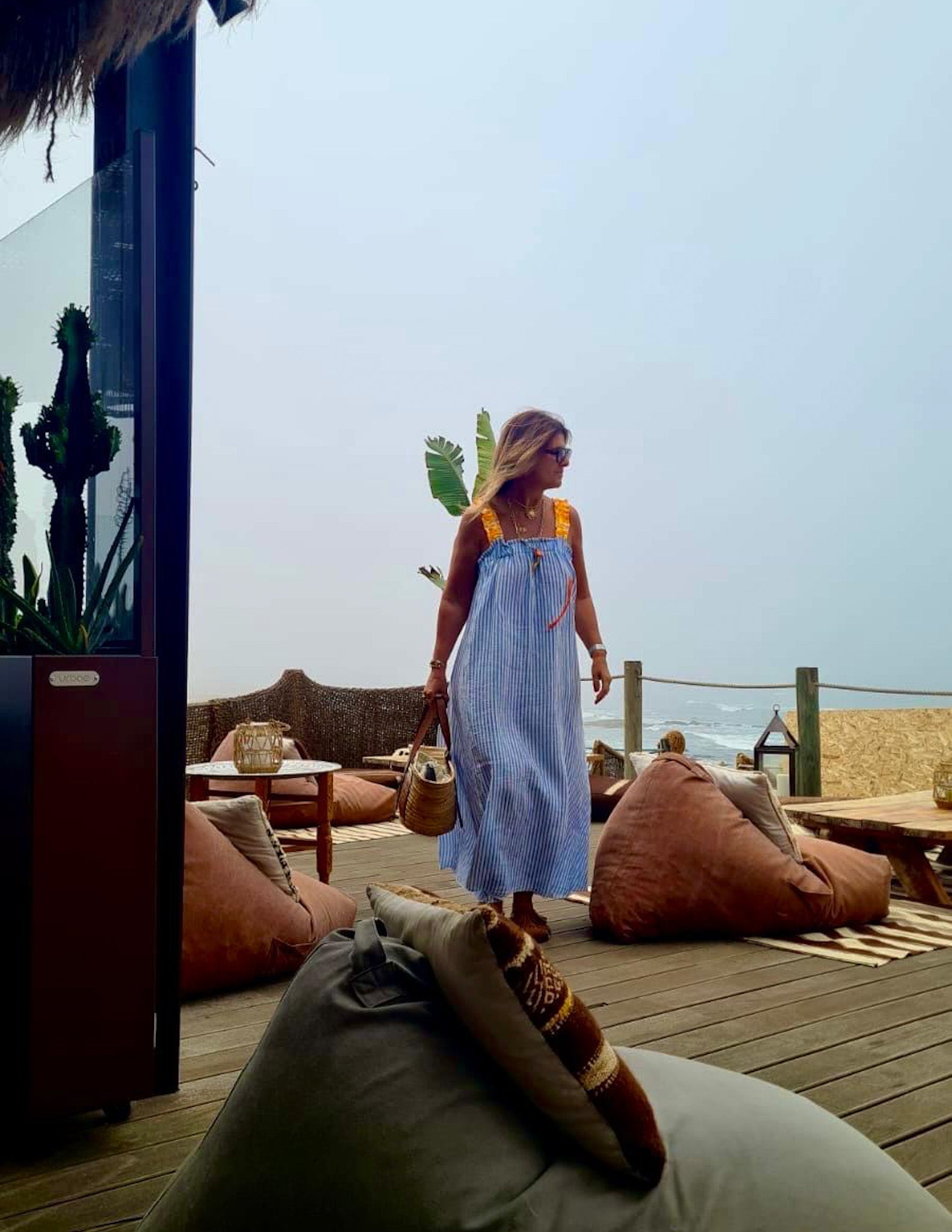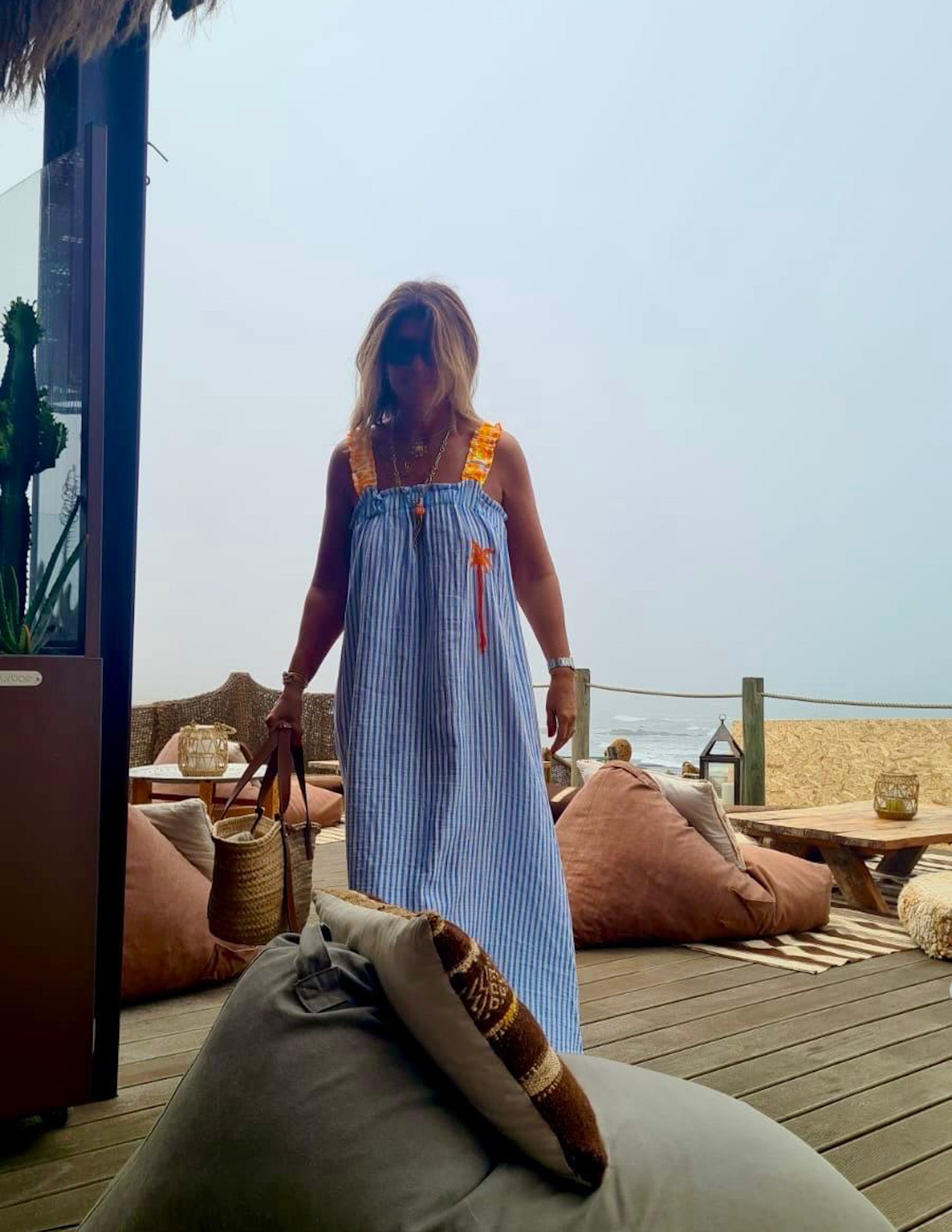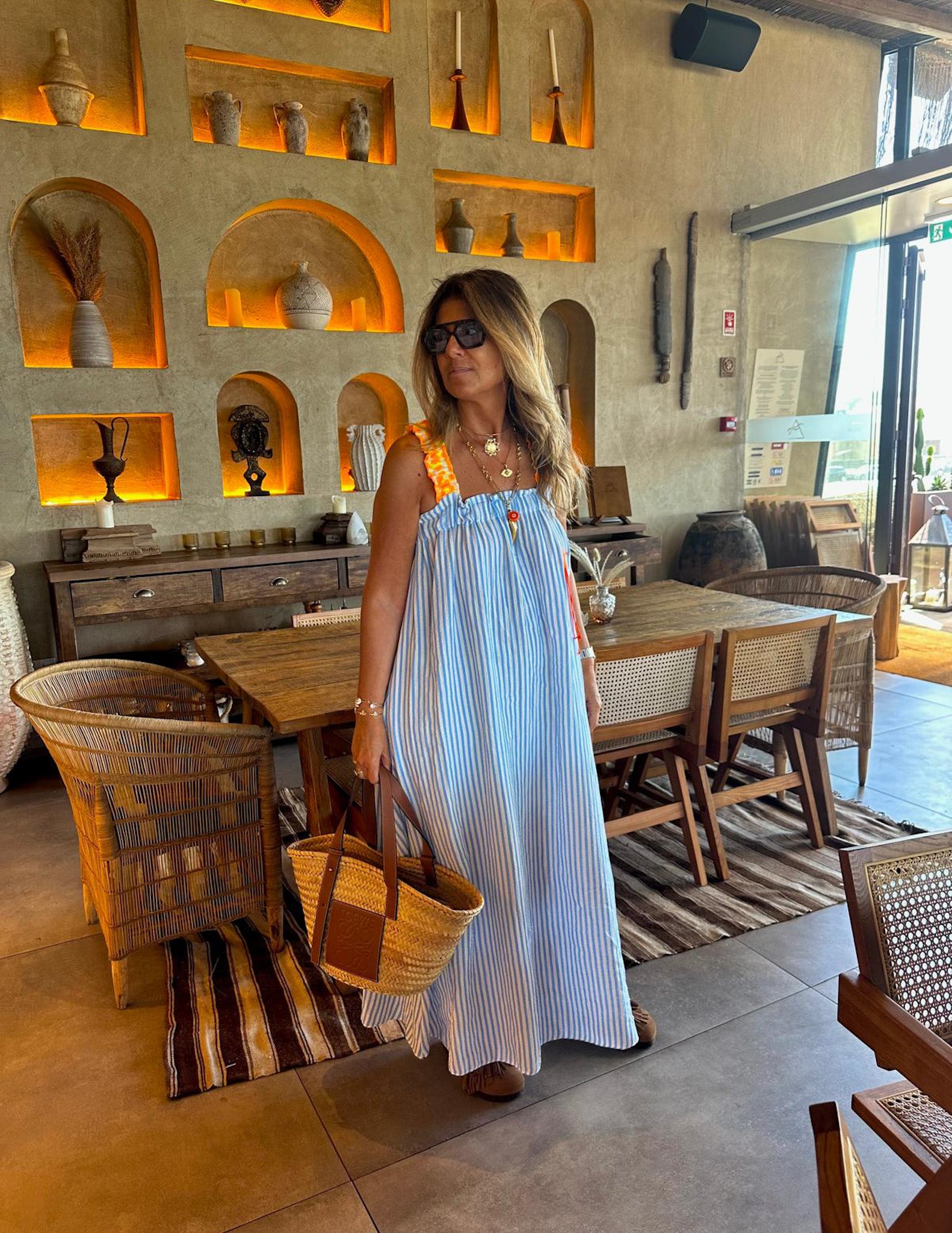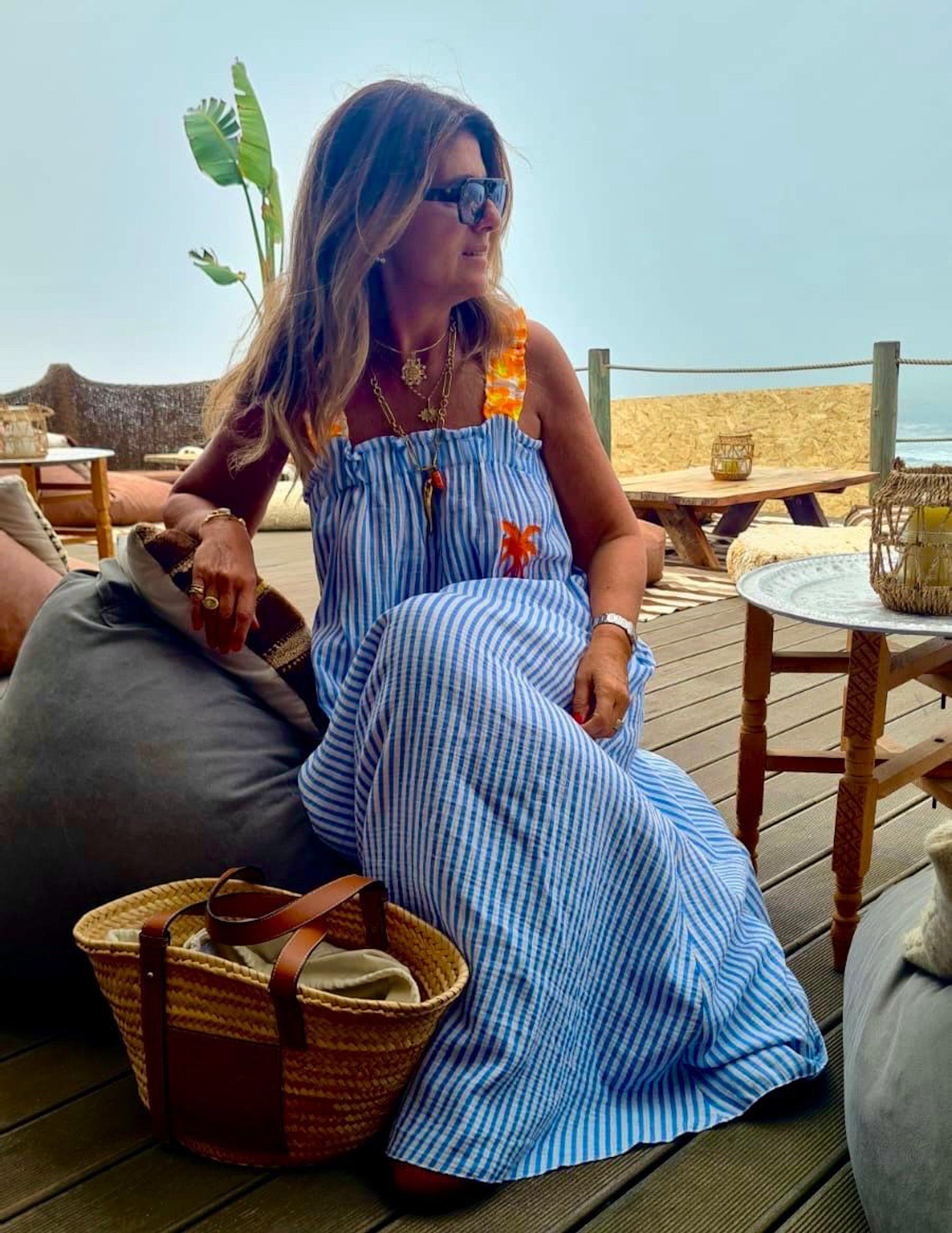 Vestido de riscas com alças de elástico em padrão leopardo. Pormenor de palmeira